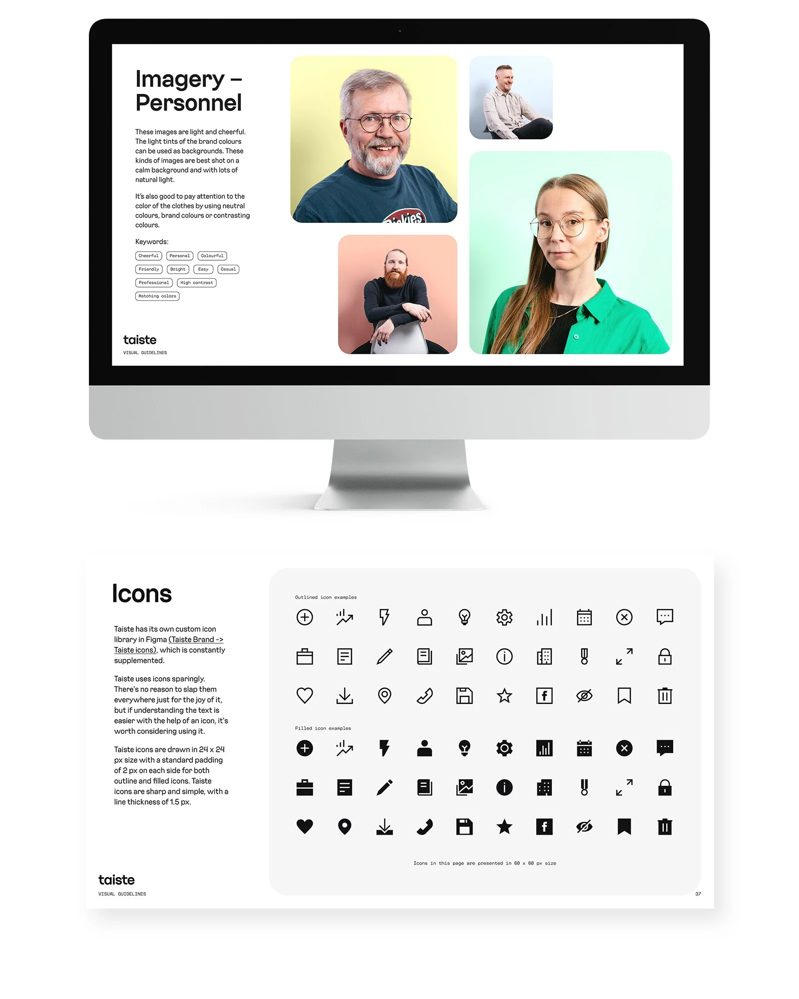 I designed the 50+ page Brand Book for my former employer Taiste using mostly existing brand elements. The visual identity of Taiste was already designed for the most part, but in this project I myself was able to define, for example, the use of graphic elements and design the icon library from scratch.
